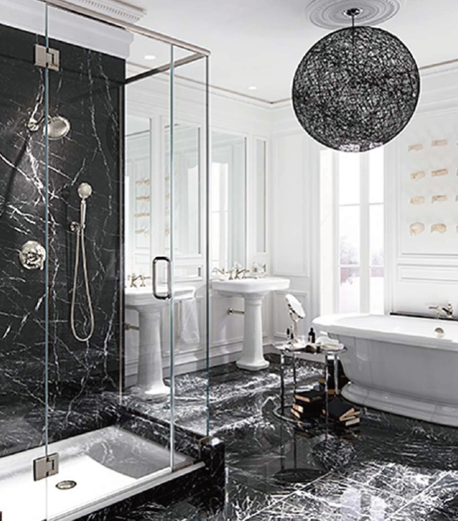 黑白相間色和銀色為攝政東風格的衛浴譜出高雅的風尚,完美演繹 80年代好萊塢全盛時期的正式端莊和大膽華麗的組合風格。