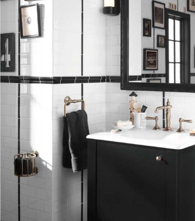 這間黑白相間的浴室是您在星期六下午逛古董店時可能會發現的“發現”寶庫。黑色通過垂直牆磚、窗飾甚至框架營造視覺秩序。
